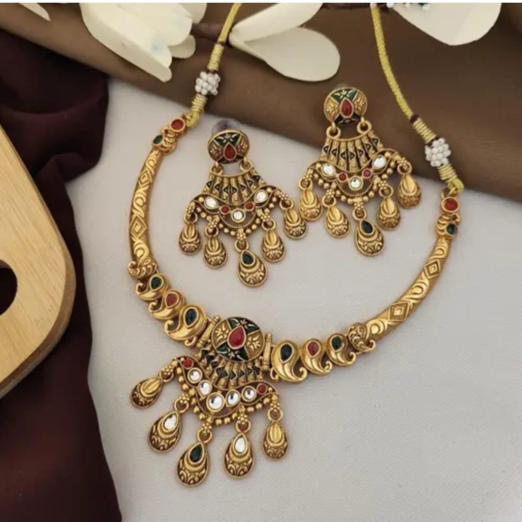 Shobham Rajwada Haar ek royal antique-style necklace hai jo purani rajwada jewellery ki grandeur ko beautifully reflect karta hai. Isme intricate gold carving, kundan-style detailing aur red–green stones ka rich combination diya gaya hai, jo is piece ko ek bold aur majestic look deta hai.